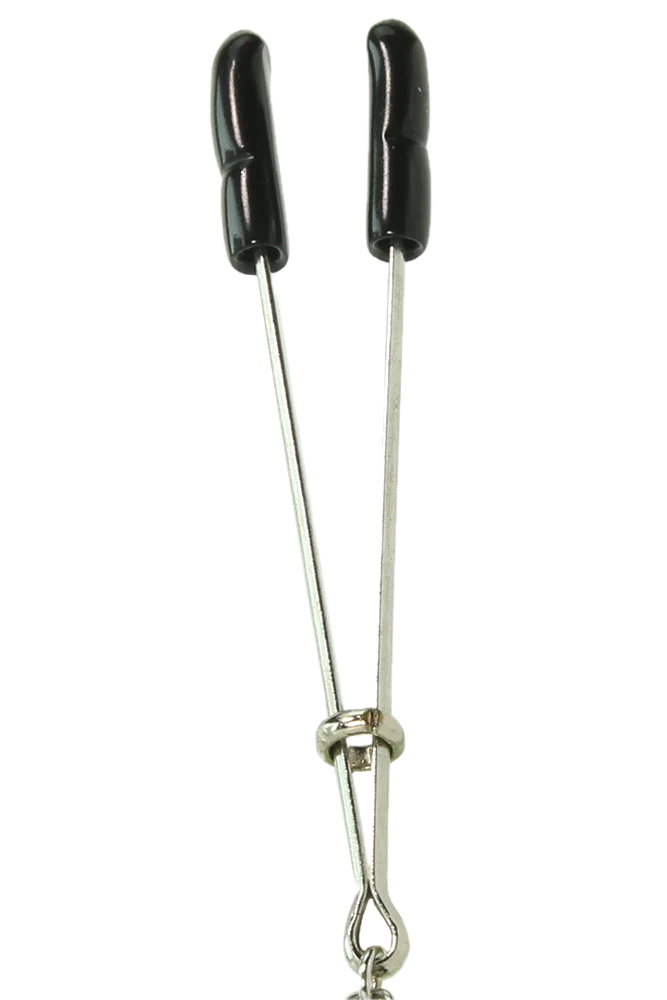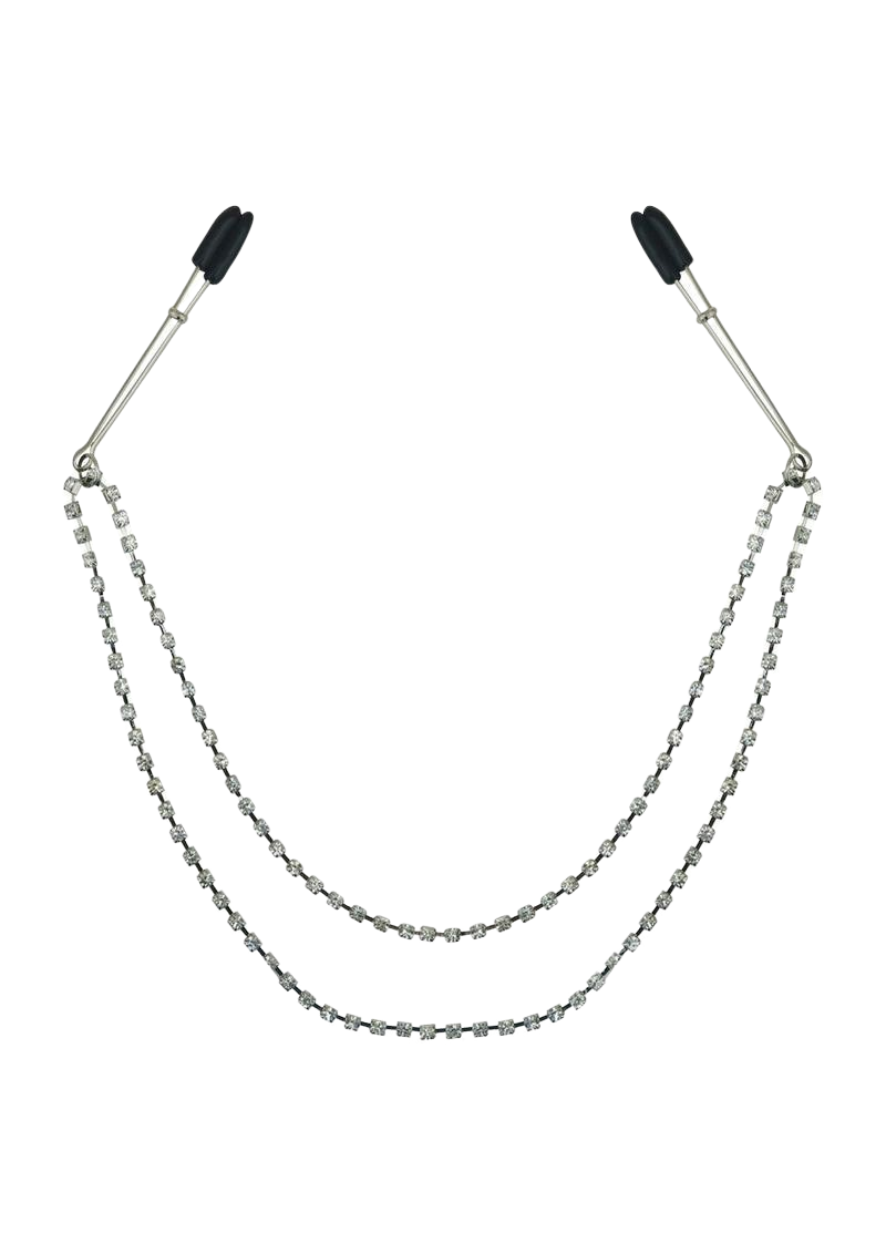 This 20 inch (50.8cm) double strand of sparkling bling will give you a formal feeling while the rubber tipped nipple clips serve as a constant reminder that everyone is entitled to feeling a little pain with their pleasure.